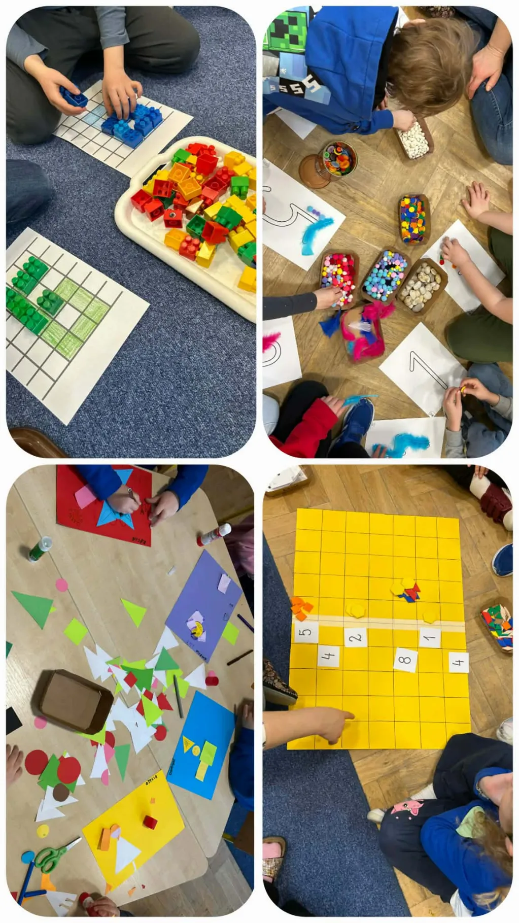 Były też ruchowe zabawy matematyczne oraz układanie klocków i liczmanów. 🧩