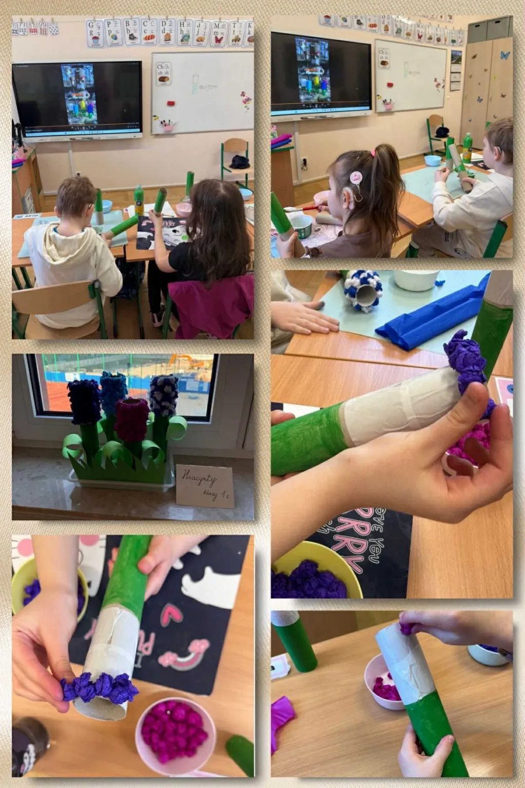 Uczniowie klasy 1c wykonali piękne wiosenne hiacynty z papierowych rolek i kulek z bibuły. Najpierw dzieci pomalowały rolki na zielono, aby powstały łodygi. Następnie formowały małe kulki z kolorowej bibuły i przyklejały je na górze rolki.