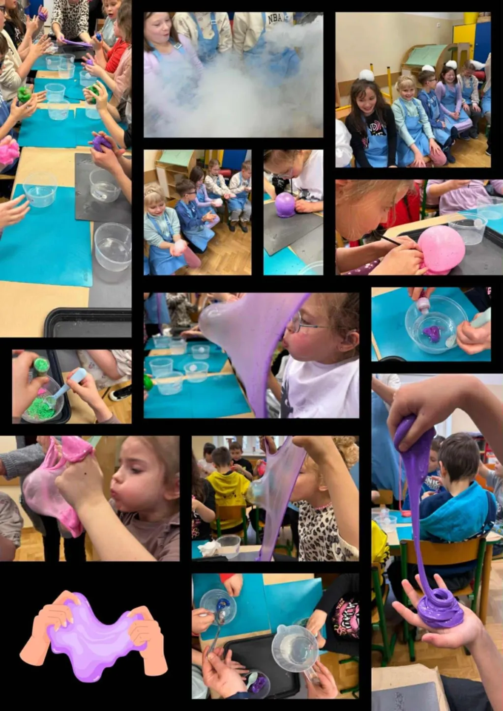 Ogromne emocje wzbudziła część degustacyjna 😋 Dzieci z dumą próbowały własnoręcznie przygotowanych, zdrowych sorbetowych lodów 🍧 oraz „dymiących” smoczych chrupek 🐉 Było naukowo, kolorowo i przede wszystkim bardzo smacznie! ✨ Na zakończenie spotkania uczniowie przygotowali własne slimy 🧫 Każdy mógł wybrać ulubione kolory, dodatki i brokat ✨ tworząc niepowtarzalne, kreatywne kompozycje. Zabawie i radości nie było końca 😄