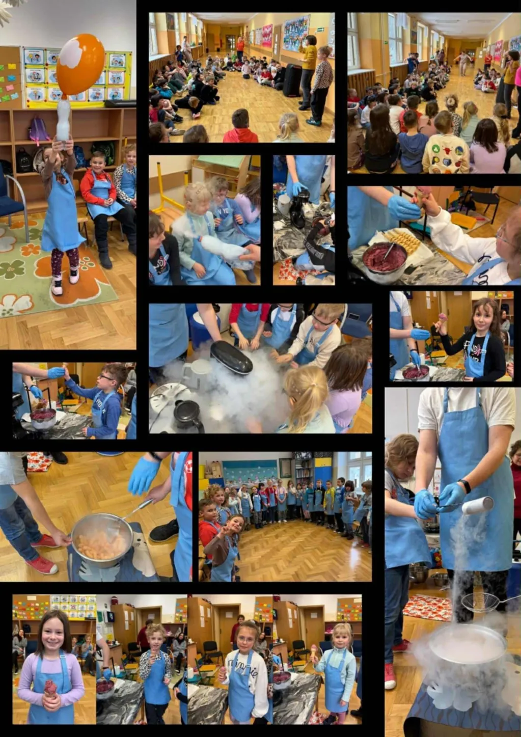🧪🍦 Kolejnym punktem programu były niezwykle efektowne warsztaty kuchni molekularnej przeprowadzone przez Bajkową Fabrykę 3D. Uczniowie wcielili się w role chemików i kucharzy 👩🔬👨🍳 – założyli fartuszki oraz okulary ochronne 🥼🥽 i pod czujnym okiem prowadzącego wykonywali doświadczenia z wykorzystaniem ciekłego azotu i suchego lodu ❄️