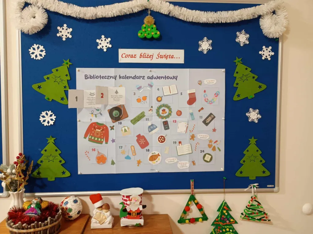 Już grudzień ❄️🎄I wraz z nim rozpoczęliśmy zabawę z bibliotecznym kalendarzem adwentowym. 📆📚 Każdego dnia na przerwie o godz. 10.10 ⏰ otwieramy nowe okienko z zadaniem do wykonania przez chętnych uczniów z klas 4-8. Gorąco zapraszamy! 🔔