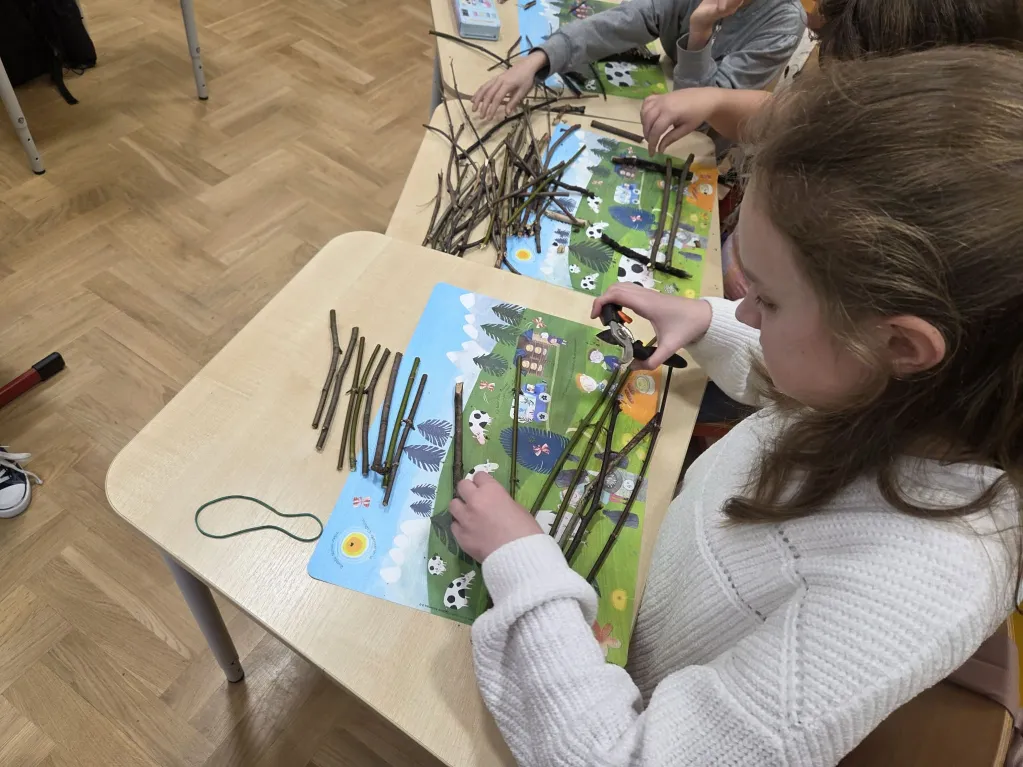 Dzieci przyniosły patyczki pozbierane podczas wspólnego spaceru z rodzicami, a następnie – krok po kroku, według instrukcji – wykonały własne tratwy.