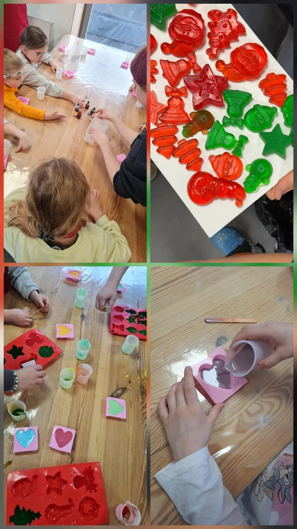 Podczas 艣wi膮tecznych warsztat贸w ka偶de dziecko w艂asnor臋cznie robi艂o 艣wi膮teczne myde艂ka, wybiera艂o kszta艂ty, kolory (zielony, czerwony, 偶贸艂ty, r贸偶owy, br膮zowy ) oraz pachn膮ce aromaty, takie jak lawenda, cynamon i czekolada 馃崼.