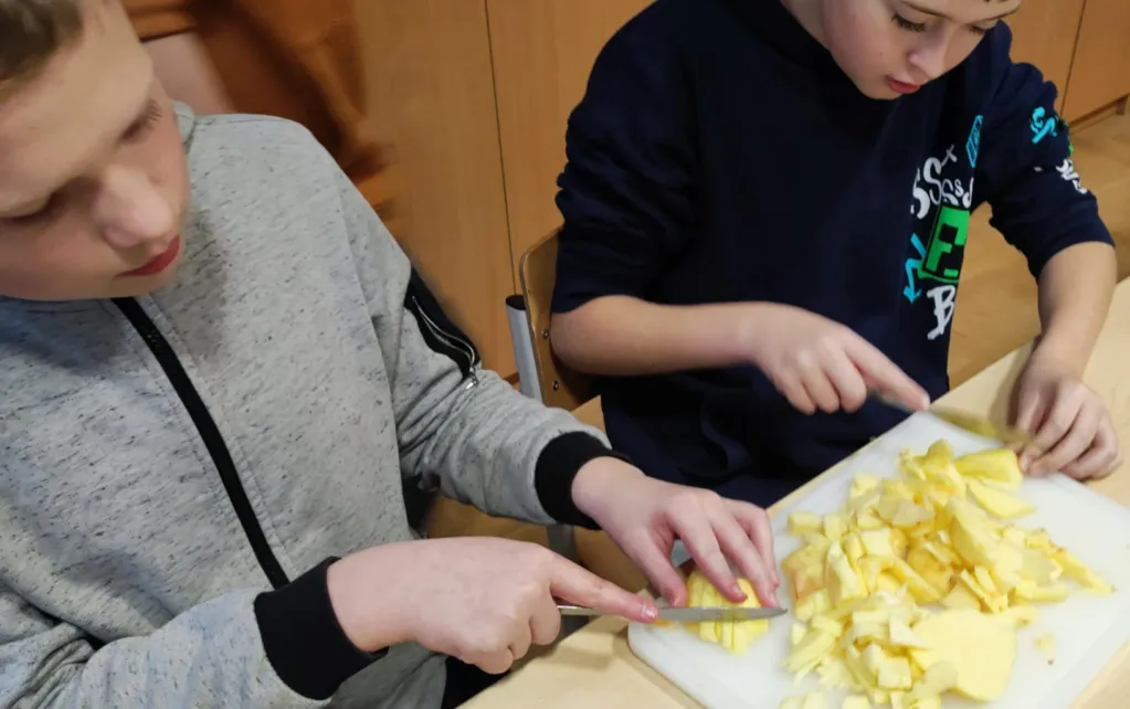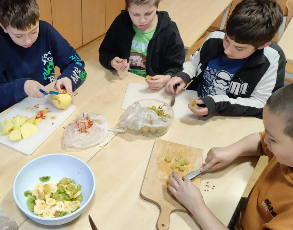 Na zajęciach edukacji zdrowotnej w klasie 4. królowała sałatka owocowa! Dzieci z uśmiechem pokroiły jabłka, banany, winogrona i kiwi, a całość połączyły z jogurtem naturalnym.