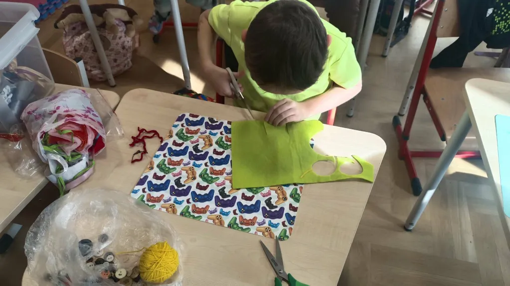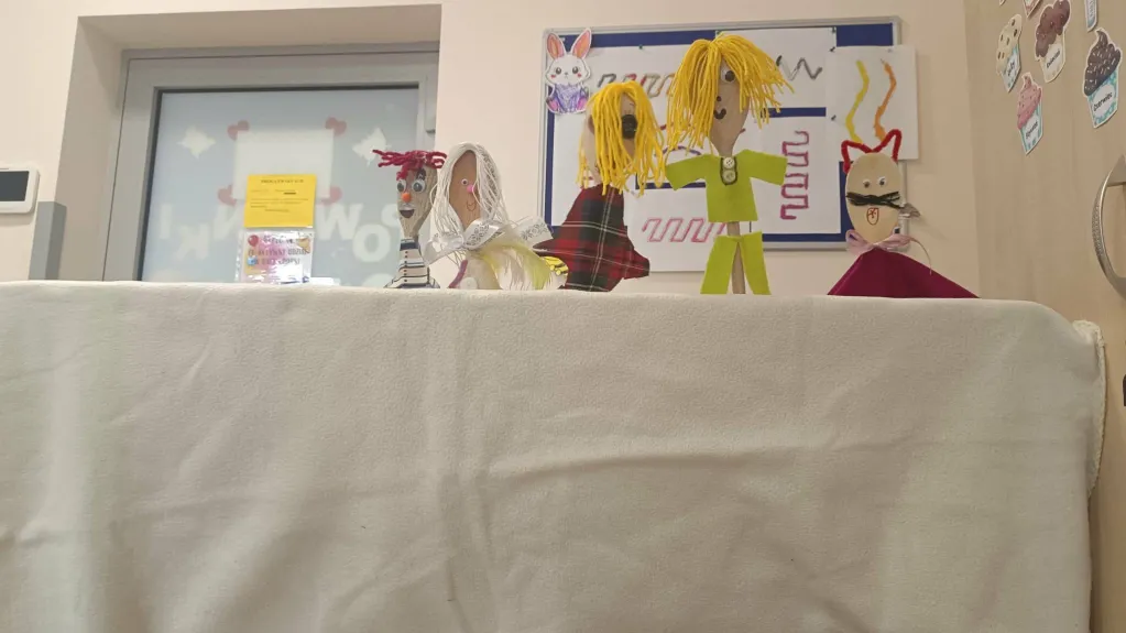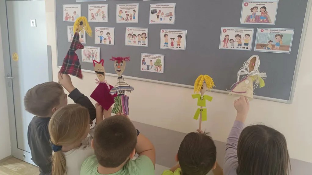 Opublikowano w Szkoła Podstawowa Teatr kukiełkowy klasa 1b Opublikowano: 04.03.2026 Na lekcji techniki klasa 1B samodzielnie wykonała kukiełki. 🎭Na zakończenie mali artyści wystawili własny spektakl teatralny. Brawo dla klasy 1B za odwagę i kreatywność! 👏✨