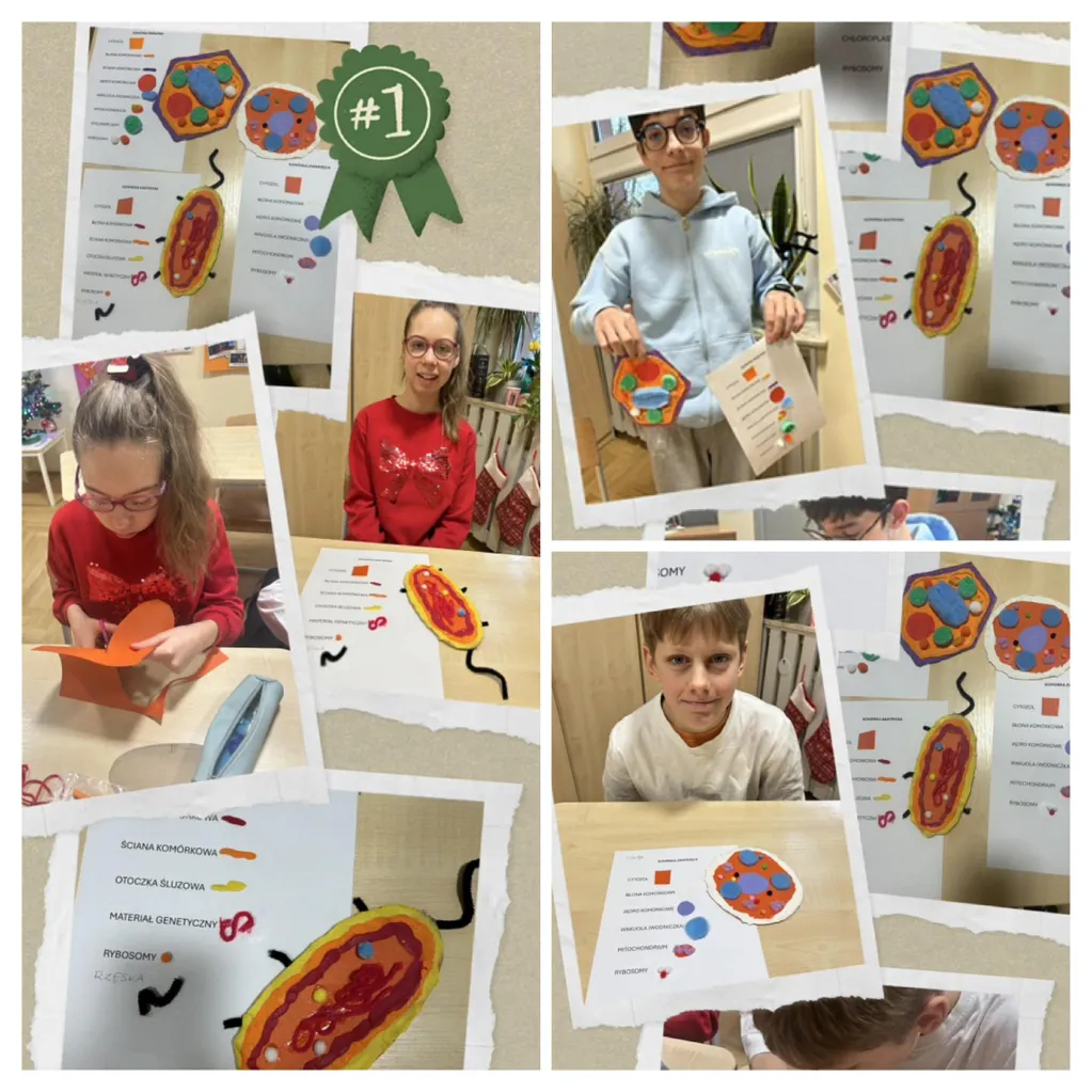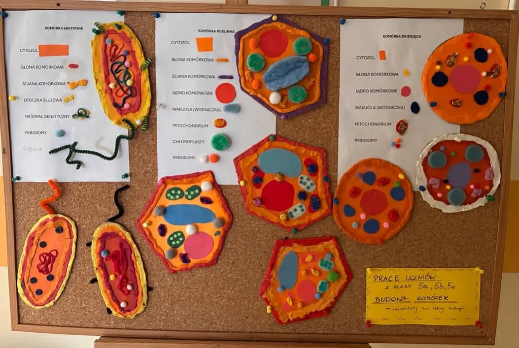 Na lekcjach biologii uczniowie klas 5a, 5b i 5c uczestniczyli w warsztatach pt. „Budowa komórki”. Uczniowie budowali modele komórek z różnorodnych materiałów, co pozwoliło im w ciekawy i praktyczny sposób lepiej poznać oraz zrozumieć ich budowę. Zajęcia były kreatywne i angażujące, a nauka przez działanie przyniosła świetne efekty.