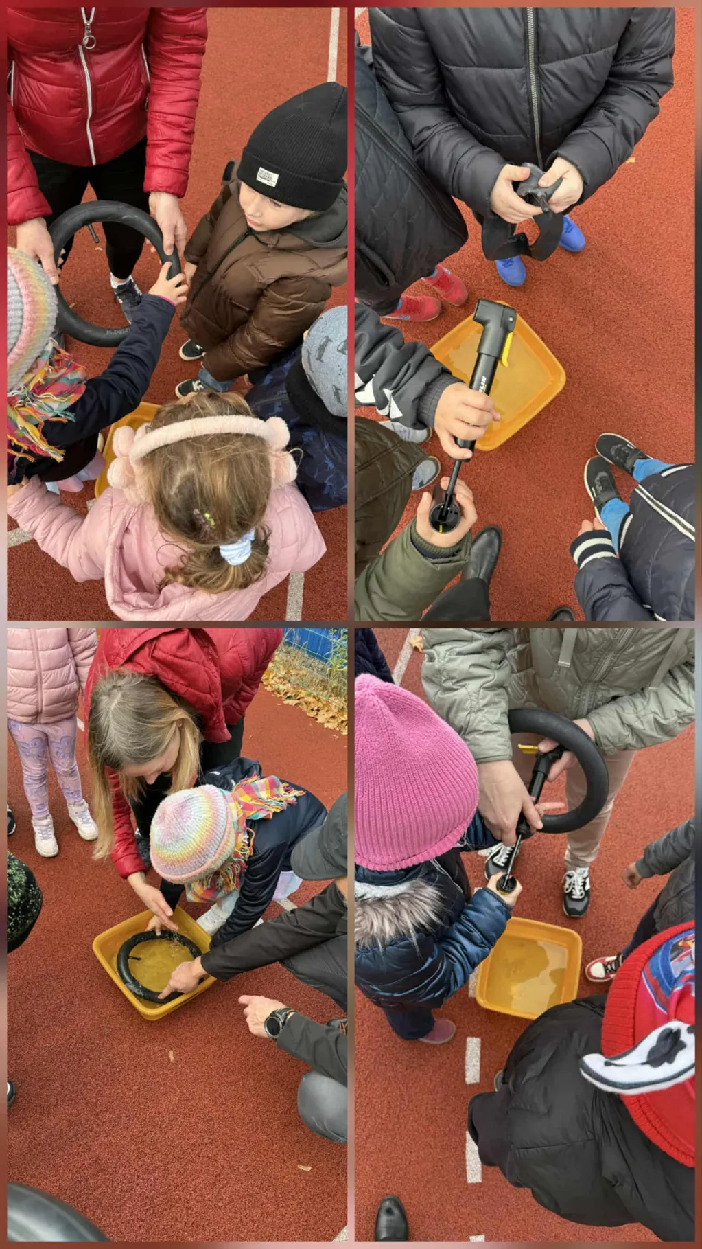 Pod okiem instruktora dzieci dowiedziały się, z czego składa się rower, do czego służy kierownica, rama, łańcuch, hamulce czy dętka. Największą atrakcją była część praktyczna w trakcie której przedszkolaki mogły samodzielnie wymienić dętkę w rowerze! 💪