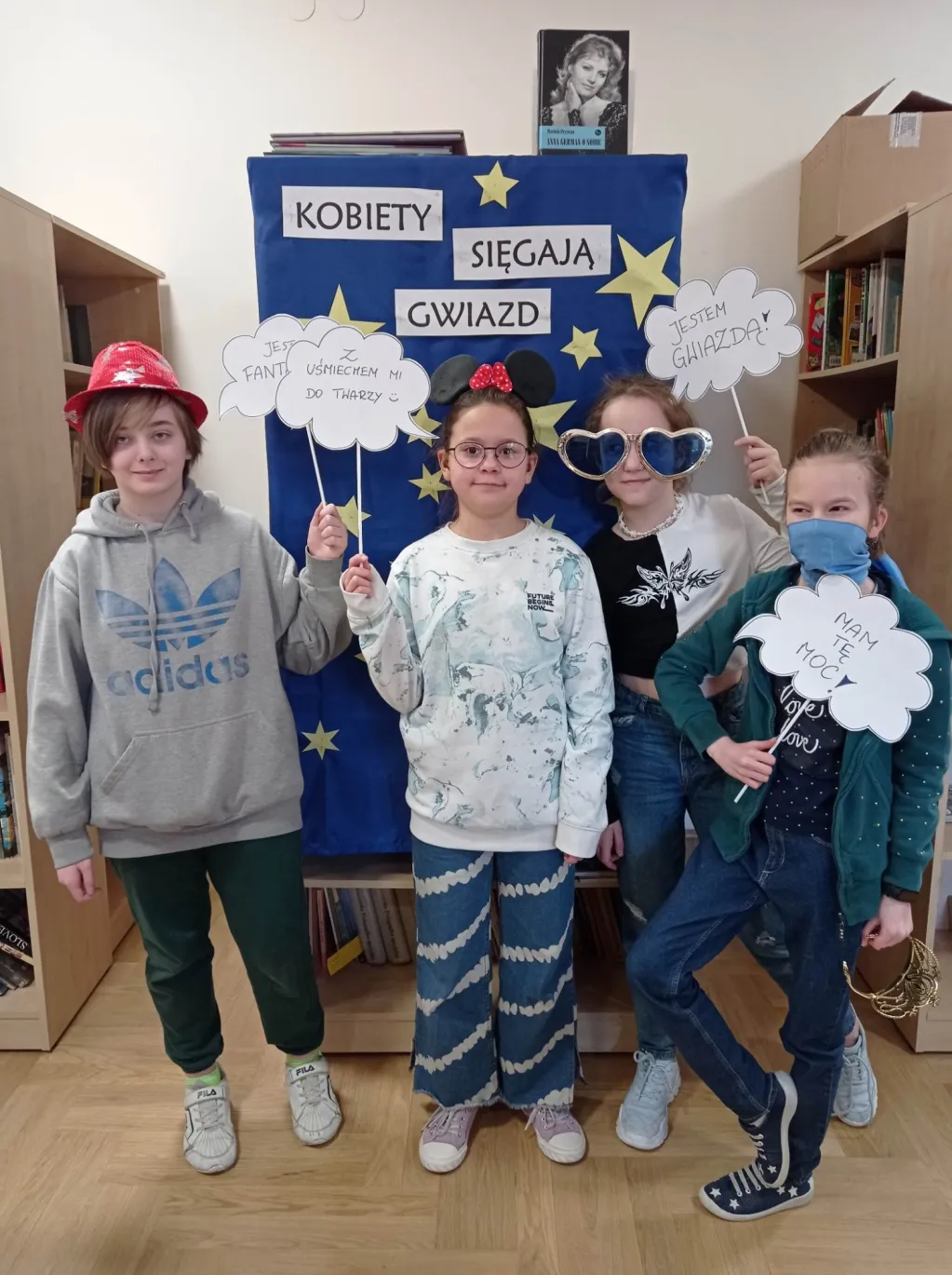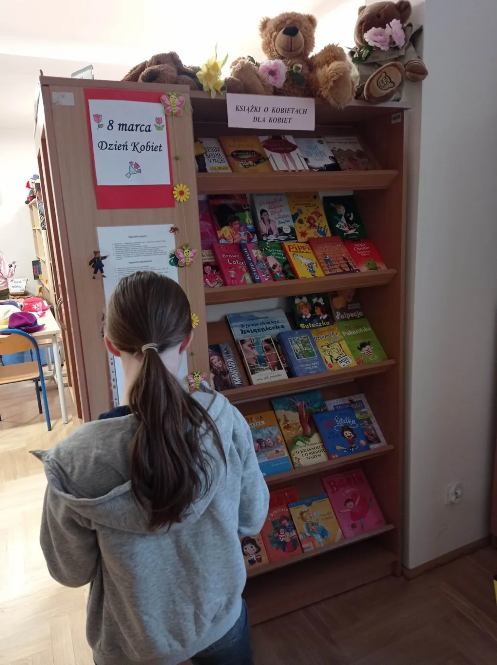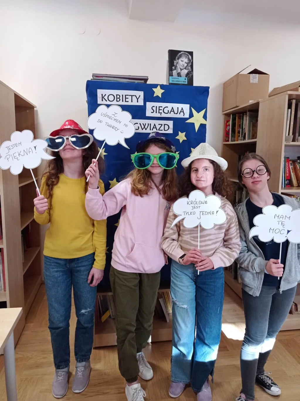 8 marca to dzień miły dla wszystkich pań, tych małych i tych większych. Biblioteka szkolna przygotowała kilka niespodzianek dla odwiedzających ją czytelniczek. Na uczennice czekała wystawa książek, w których bohaterkami są dziewczęta. Na tablicy mogły zobaczyć zdjęcia słynnych i wpływowych kobiet świata, a także poznać historię mody damskiej od starożytności do czasów współczesnych. Cały dzień w sali bibliotecznej rozbrzmiewała relaksująca muzyka, a w Kąciku Relaksu można było poczytać czasopisma kobiece oraz wyrazić siebie podczas kolorowania najróżniejszych rysunków. Na chętne damy czekała fotościanka zatytułowana „Kobiety sięgają gwiazd” (pomysł wykorzystany za zgodą #BibliotekaPublicznaLubicz). Akcja, której celem było rozbudzić wśród dzieci pasję do czytania i zachęcić do częstszego odwiedzania biblioteki, cieszyła się dużym zainteresowaniem. Uczennice świetnie się bawiły.