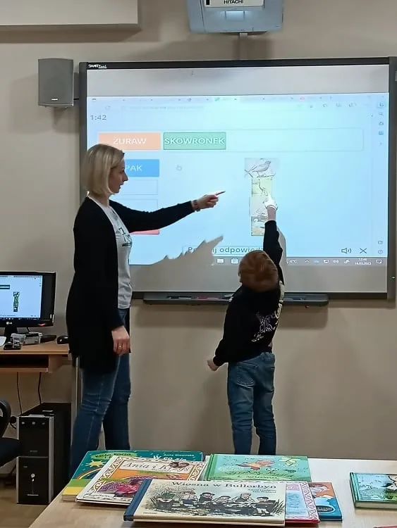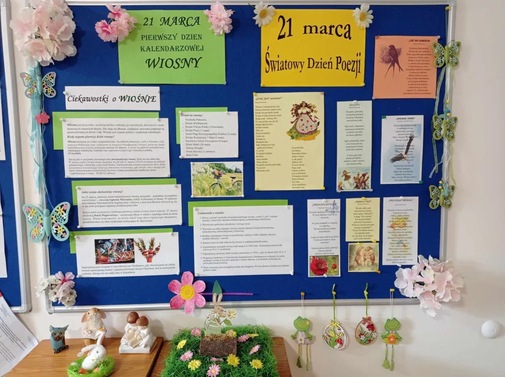 W czwartek bibliotekę szkolną odwiedziły dzieci ze świetlicy szarej wraz z wychowawczynią, panią Katarzyną Piechotą. Próbowaliśmy wspólnie odpowiedzieć na pytanie: „Gdzie jest wiosna?”. W ramach wprowadzenia do zajęć rozwiązywaliśmy zagadki wiosenne oraz obejrzeliśmy książki o tematyce wiosennej, które można wypożyczać w naszej bibliotece. Czytelnicy wysłuchali wiersza Stanisława Karaszewskiego pt. „Zwiastuny wiosny”, a następnie wymienili te, o których była mowa w tekście. Obejrzeliśmy film przedstawiający zmiany zachodzące wiosną. Poznaliśmy pierwsze wiosenne kwiaty, które są objęte ochroną w Polsce oraz te, które można zrywać i tworzyć z nich bukiety. Na koniec zajęć podsumowaliśmy zdobyte wiadomości przy wykorzystaniu tablicy multimedialnej, a potem każdy wykonał pracę plastyczną przedstawiającą wybrany wiosenny kwiat.