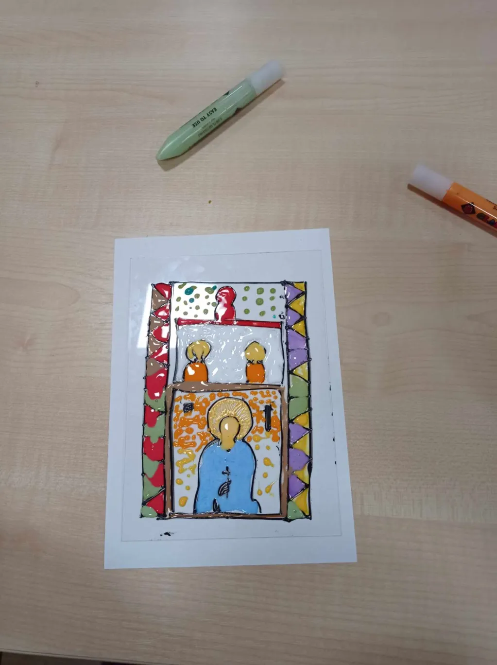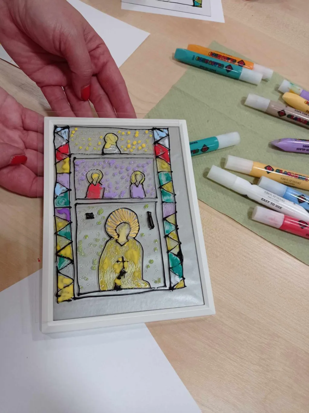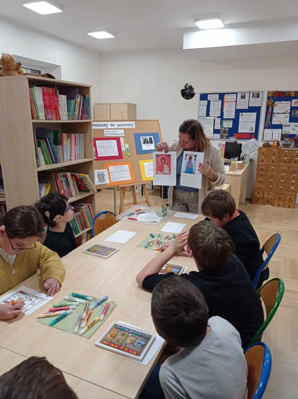 W piątek 6 października 2023r. w bibliotece szkolnej odbyły się warsztaty twórcze pod hasłem: „Nowosielski inspiruje”. Gościliśmy Panią Emilię Kaczmarczyk, która opowiedziała uczniom klas 4a i 4b o Jerzym Nowosielskim, polskim malarzu i rysowniku oraz zapoznała ich z historią pisania ikon. Po ciekawym wprowadzeniu uczestnicy przystąpili do samodzielnego dekorowania wcześniej przygotowanych szkiców obrazów za pomocą specjalnych farb witrażowych. Obrazy dzieci były pomysłowe, kolory przemyślane, a samo wykonywanie ikon zaangażowało dzieci przez cały czas trwania pracy. Wszyscy zgodnie stwierdzili, że chętnie ponownie wzięliby kiedyś udział w takich zajęciach.