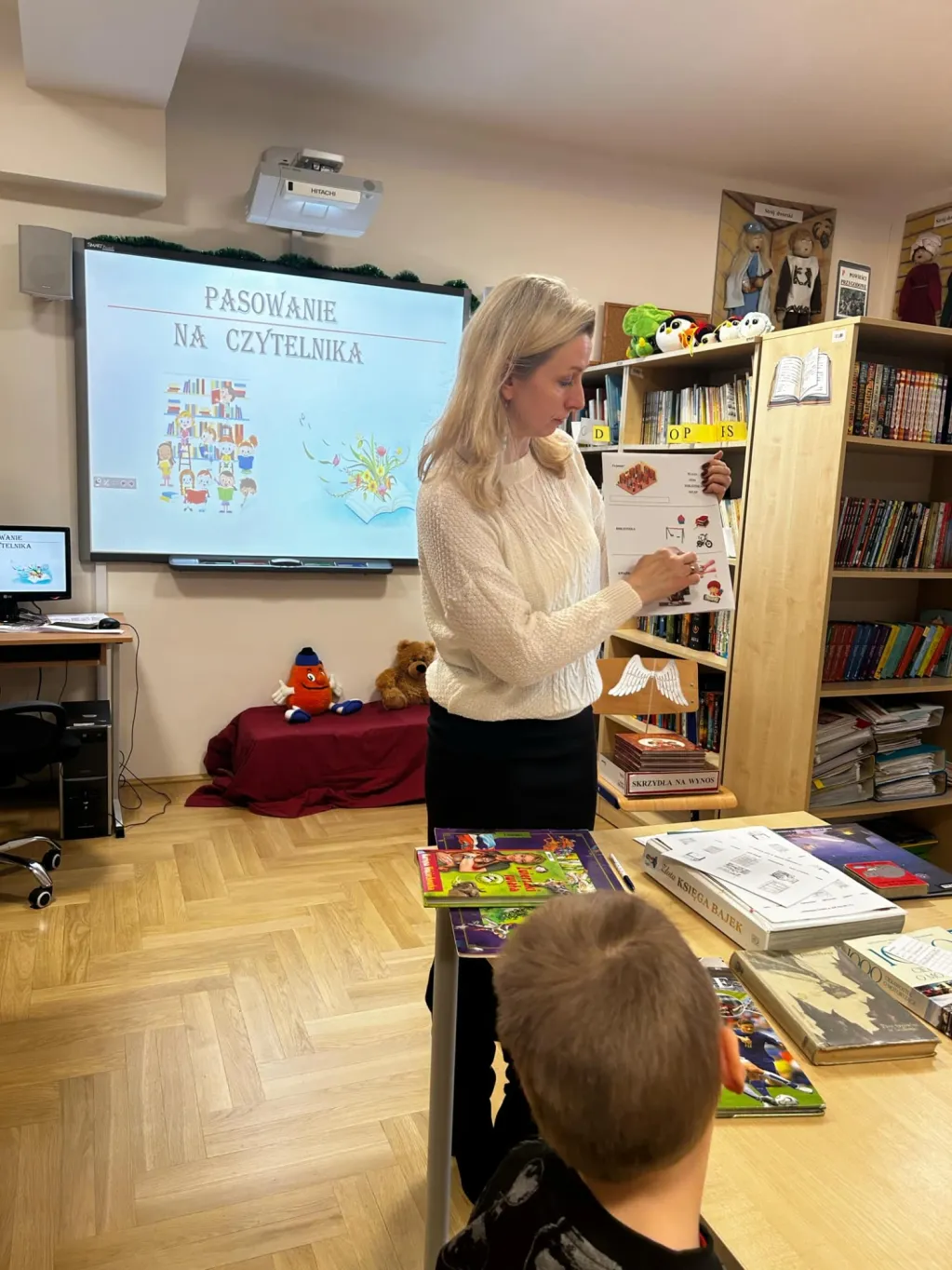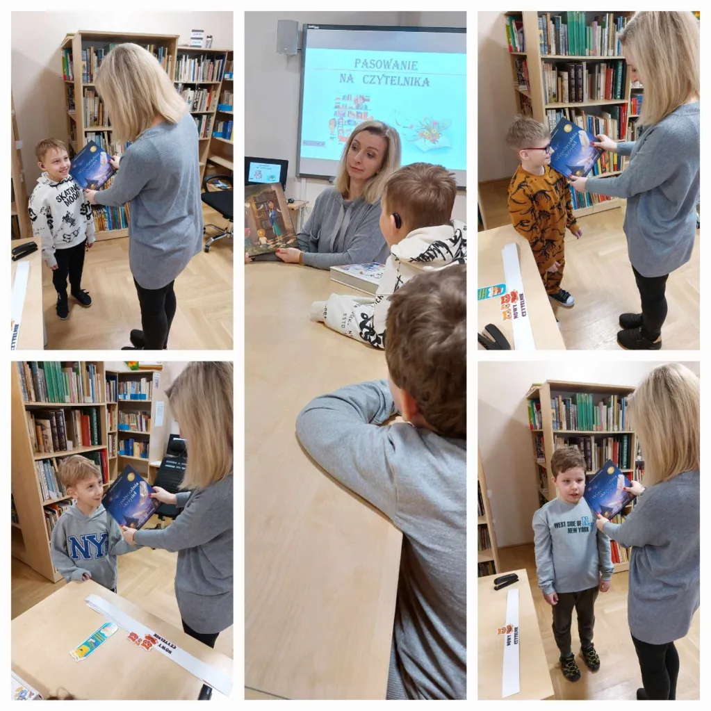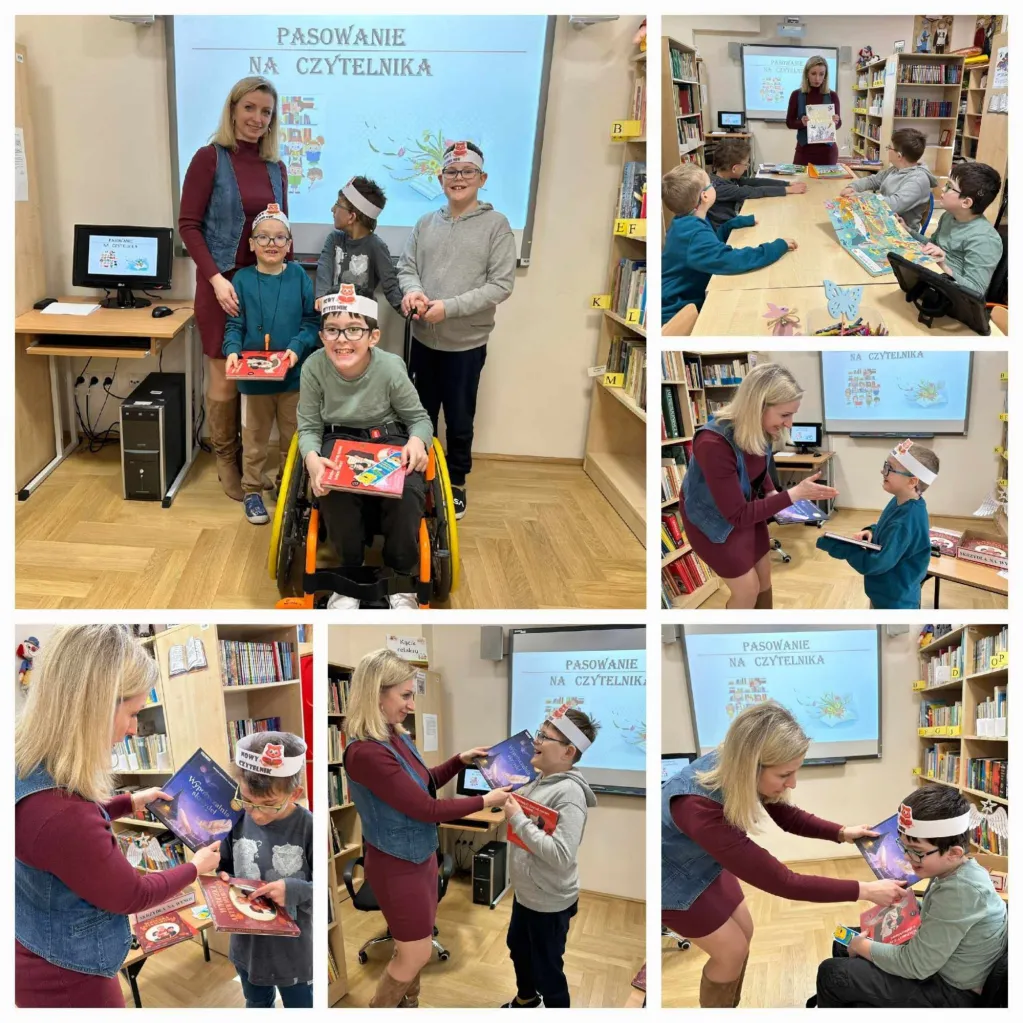 Po pasowaniu na ucznia przyszedł czas na pasowanie na czytelnika. Dzieci z klas pierwszych odwiedziły bibliotekę, poznały podstawowe słowa dotyczące bycia czytelnikiem i zapoznały się z prośbami książki. Potem uczniowie odpowiadali na pytania, o co książki apelują. Nauczyciele bibliotekarze przeprowadzili krótką pogadankę na temat regulaminu biblioteki szkolnej, jej zbiorów oraz zasad wypożyczania książek.