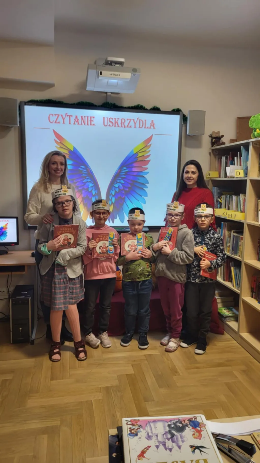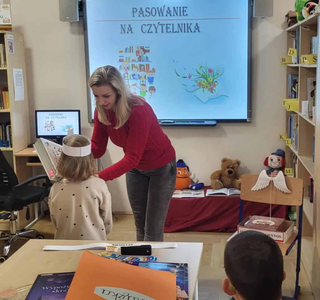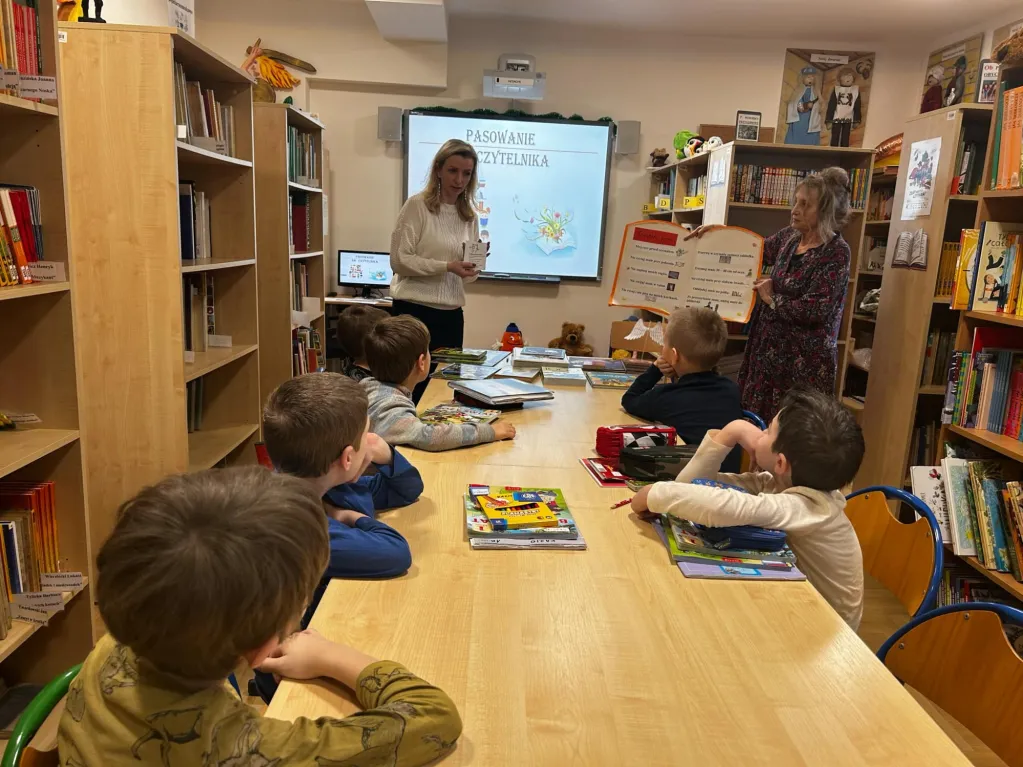 Wraz z pojawieniem się wiosny, do szkolnej biblioteki przybyli uczniowie klas pierwszych na uroczystość Pasowania na czytelnika. Podczas spotkania pani bibliotekarka opowiadała o bibliotece, o książkach, które się w niej znajdują oraz o zasadach wypożyczania. Pierwszoklasiści dowiedzieli się, o co proszą wypożyczane książki i złożyli przyrzeczenie, że będą z powagą traktować obowiązki czytelnika. Uważnie wysłuchali opowieści pt.: „Wypożyczalnia skrzydeł” mówiącej o tym, że czytanie to magia, biblioteka to świat wyobraźni i mądrości, a książki to skrzydła, które mogą unieść czytelnika ku niezapomnianej przygodzie. Nie obyło się też bez prezentów. Każdy nowy czytelnik został obdarowany „skrzydłami na wynos” – czyli wyprawkami czytelniczymi od Instytutu Książki. Całe wydarzenie zakończyliśmy pamiątkowym zdjęciem wykonanym za pomocą aparatu fotograficznego z Programu „Laboratoria Przyszłości”.